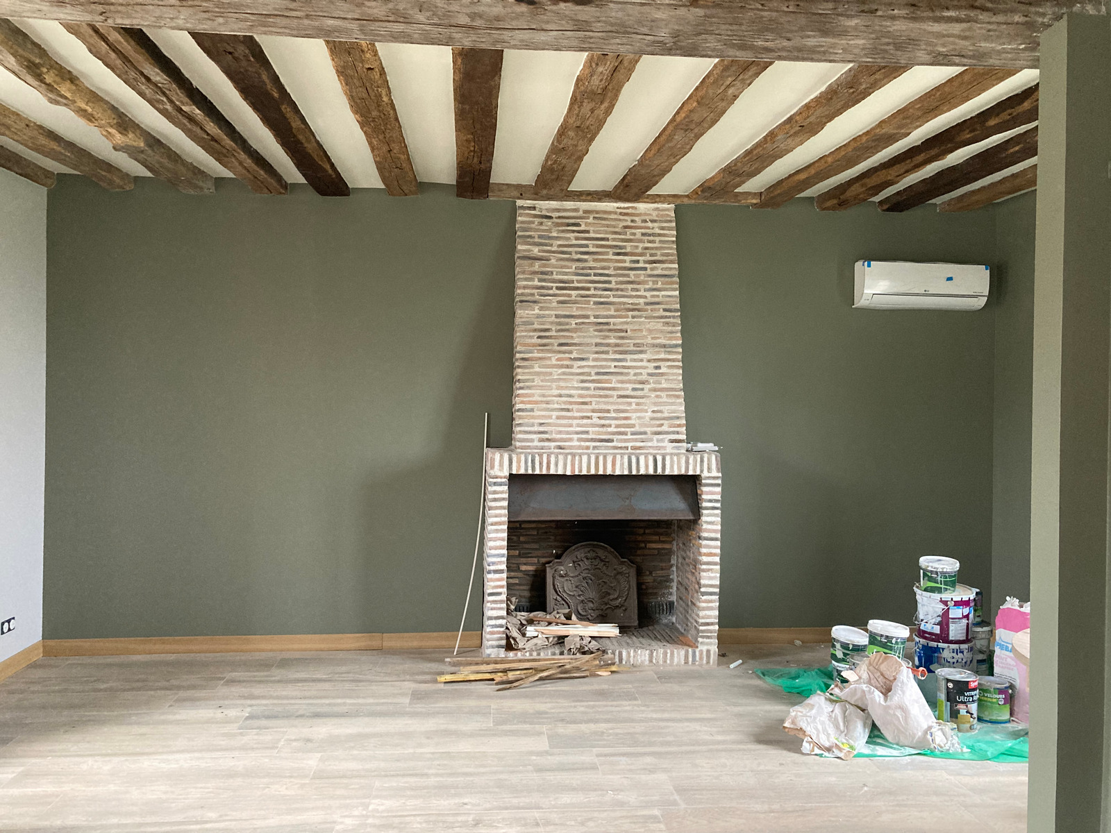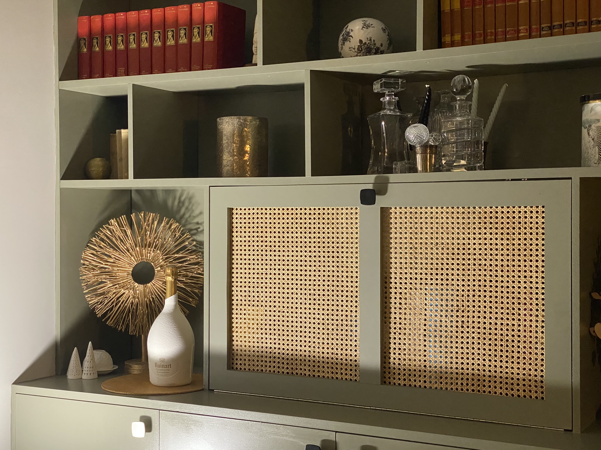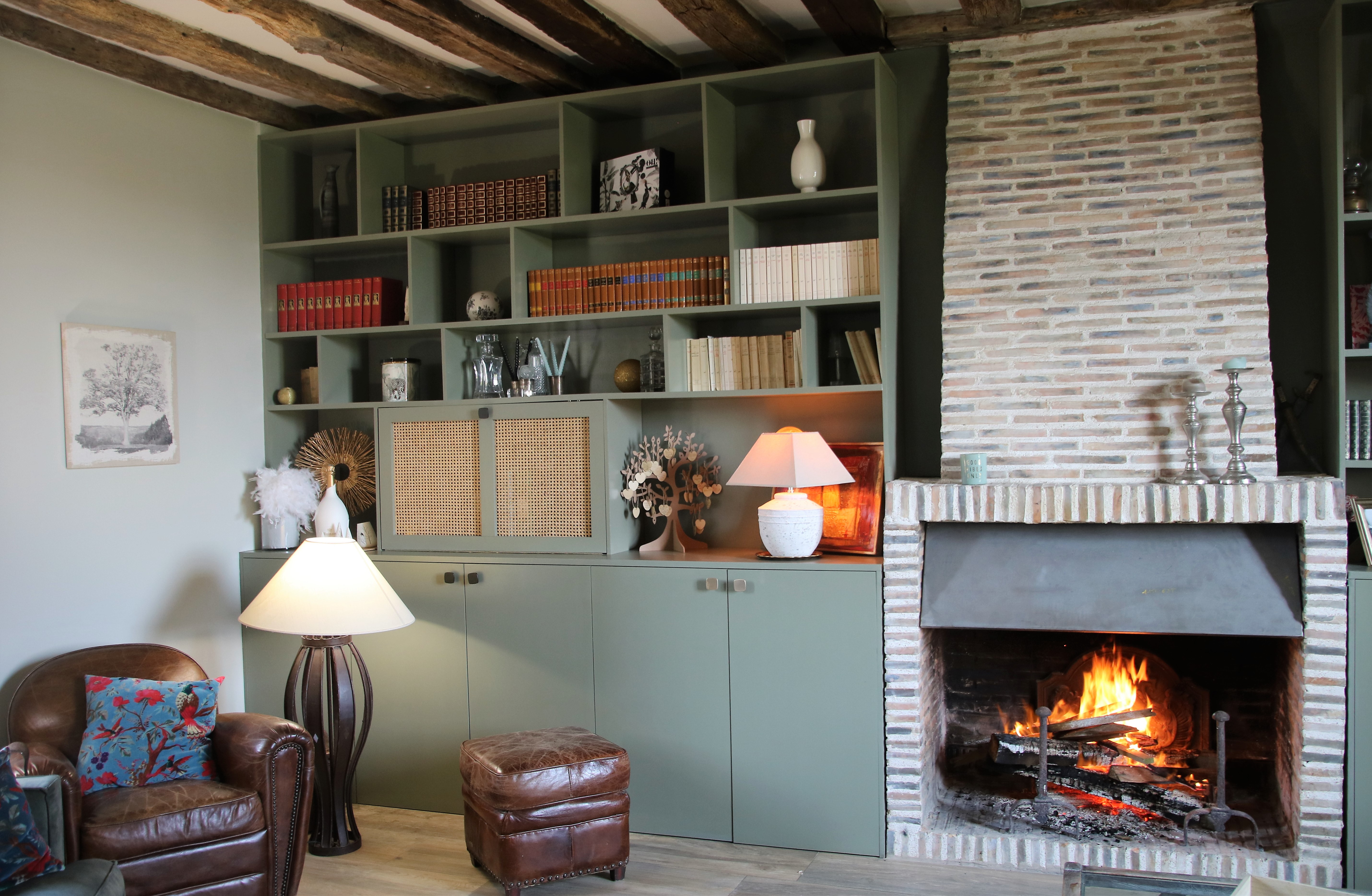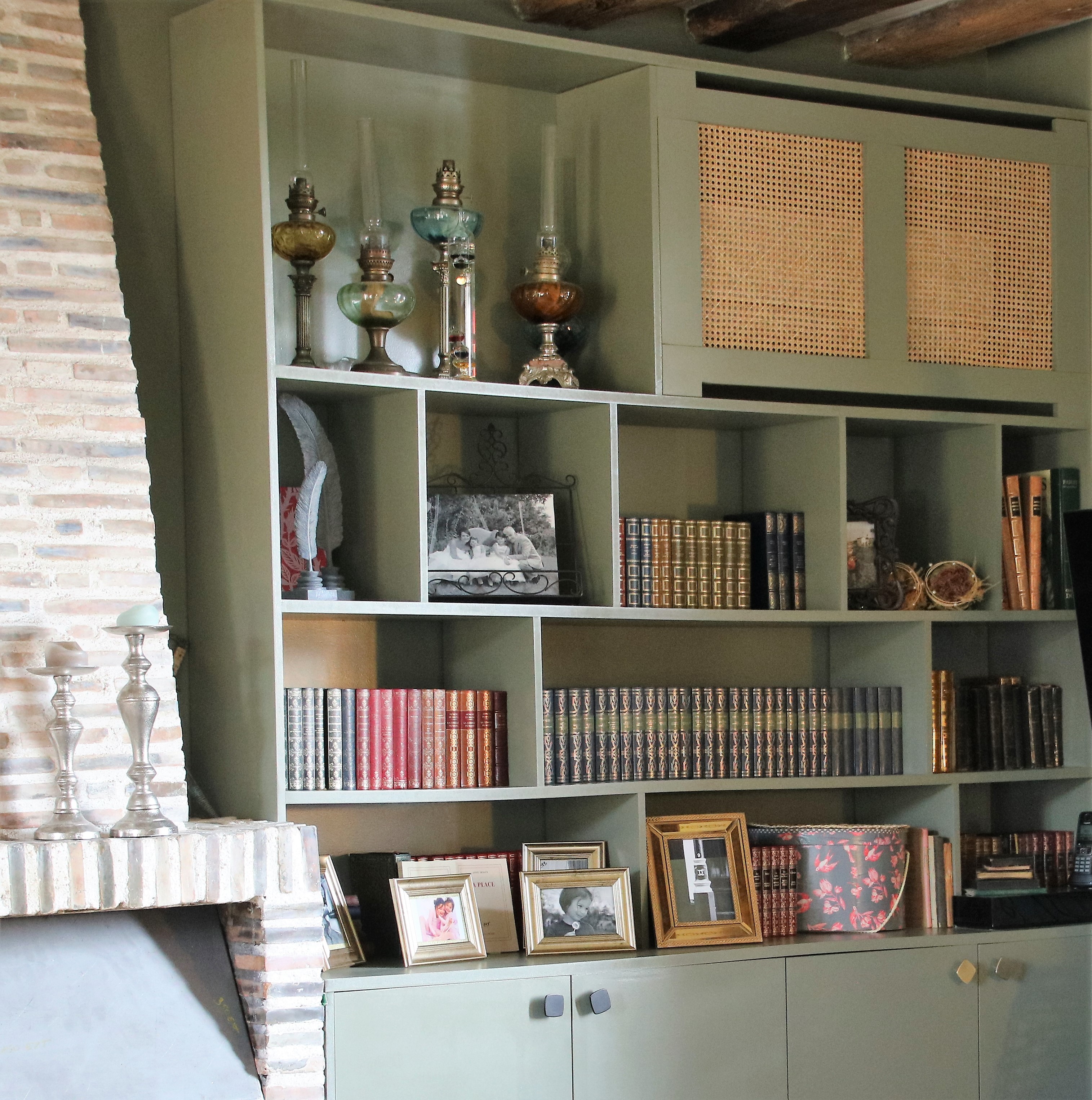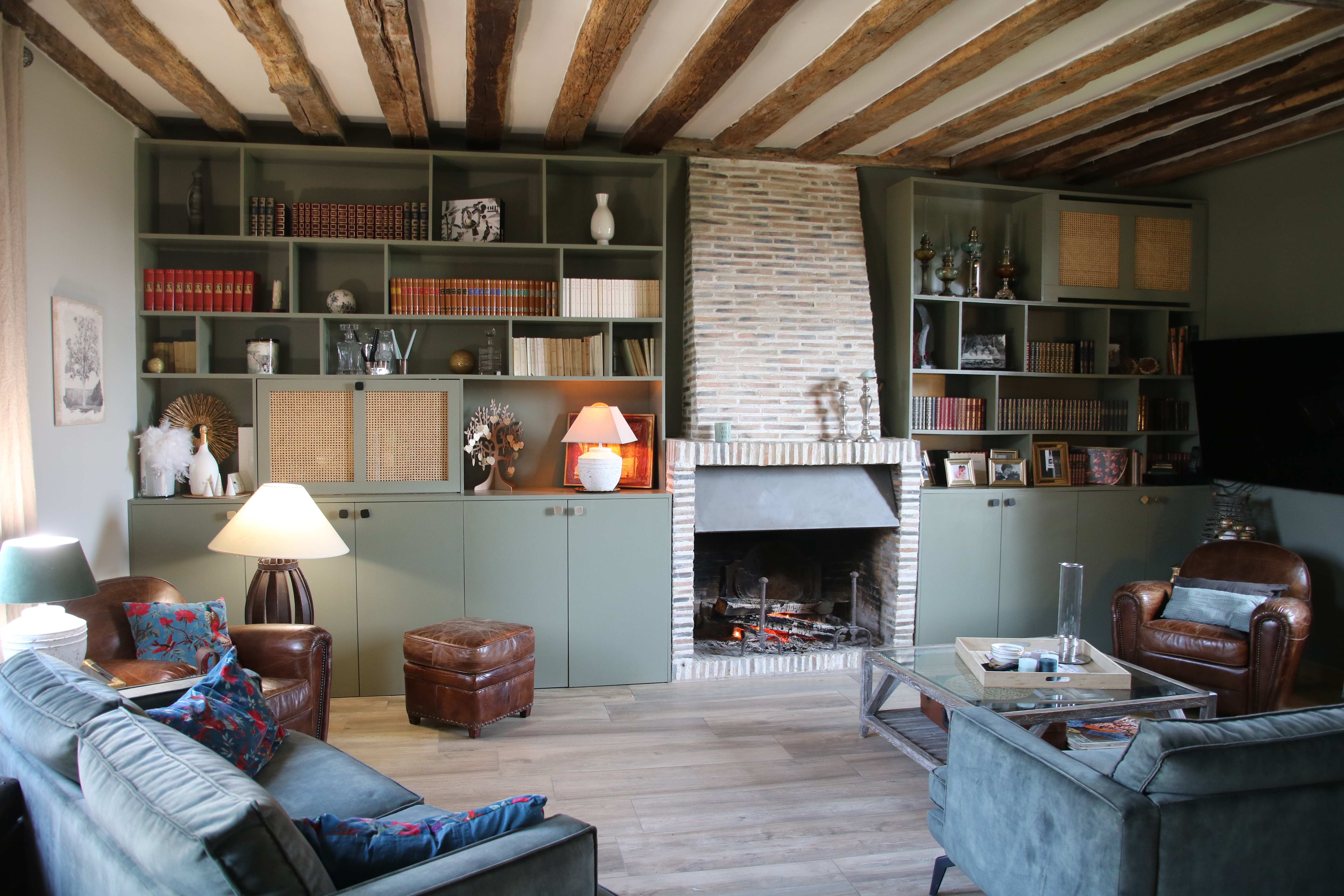 Ambiance campagne chic avec cette bibliothèque toute hauteur parfaitement intégrée. Sa couleur apporte une profondeur irrésistiblement chaleureuse à ce salon de lecture.