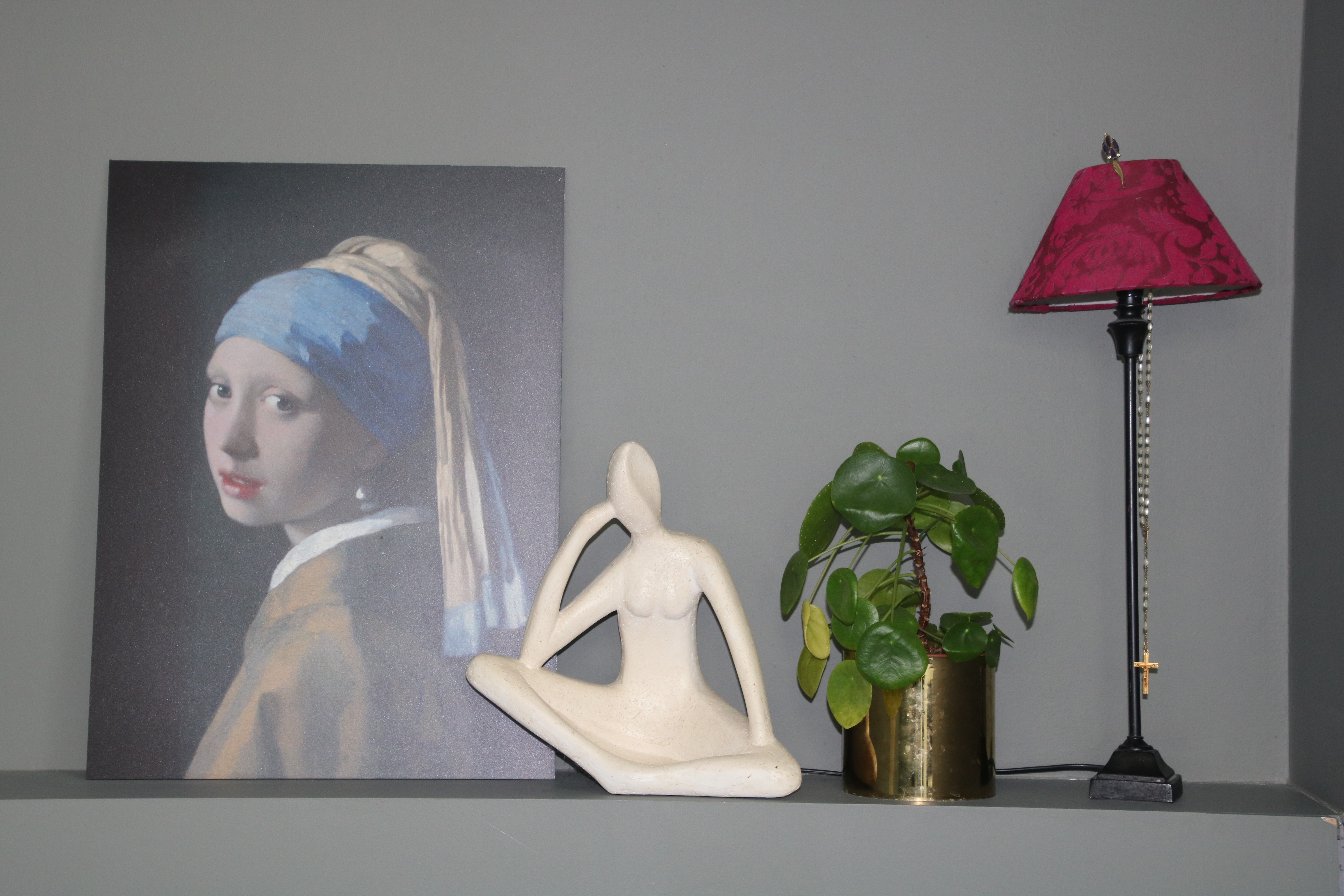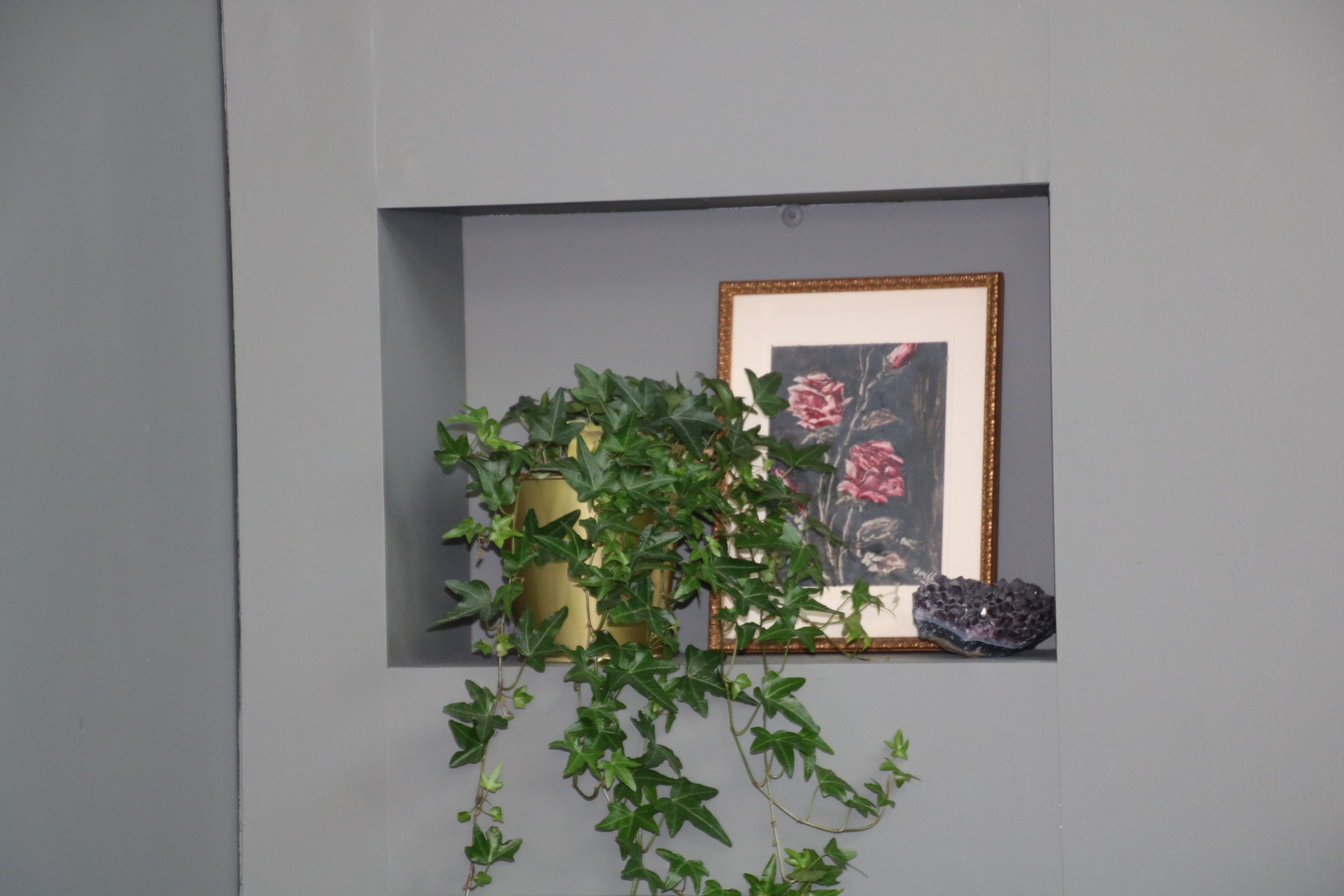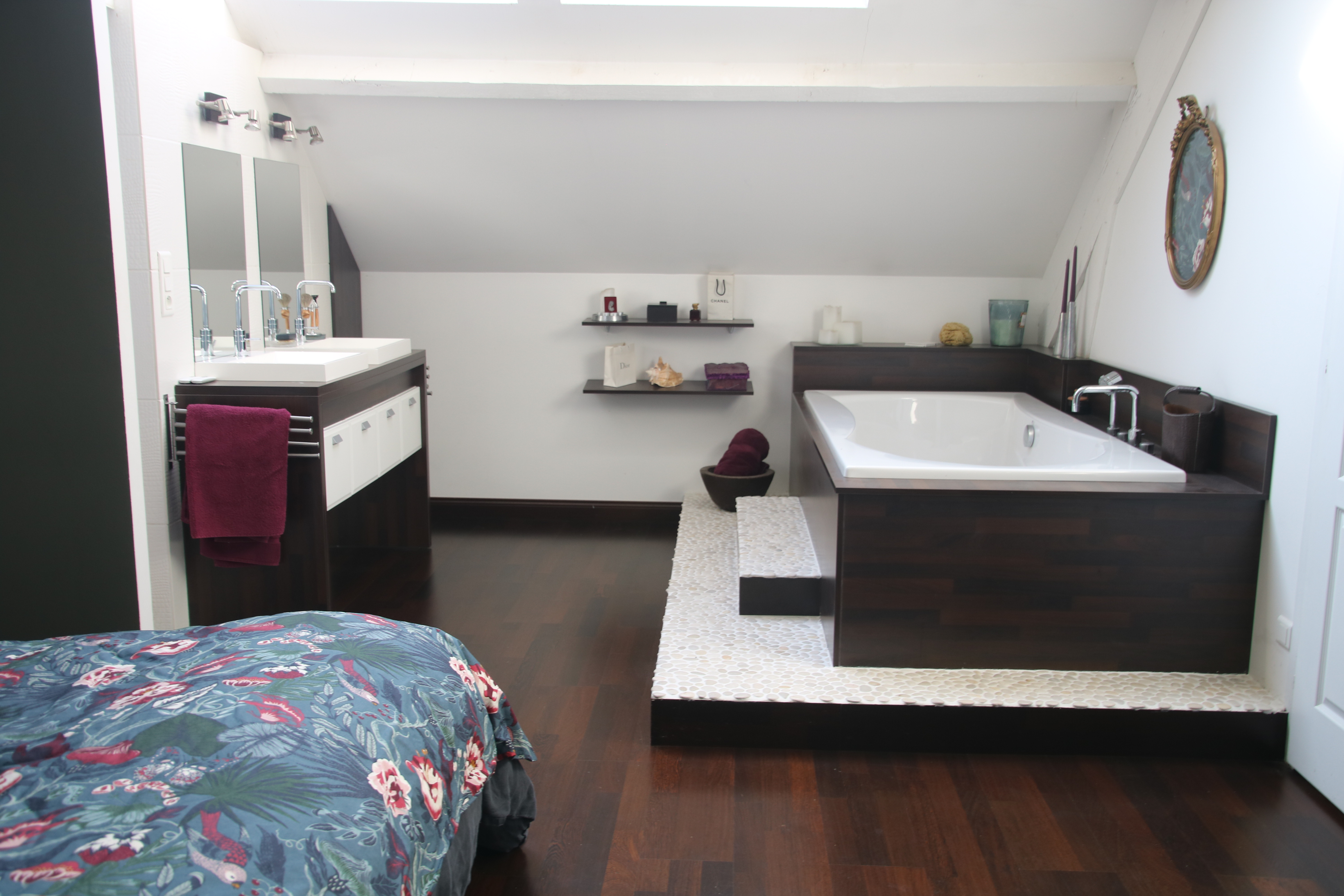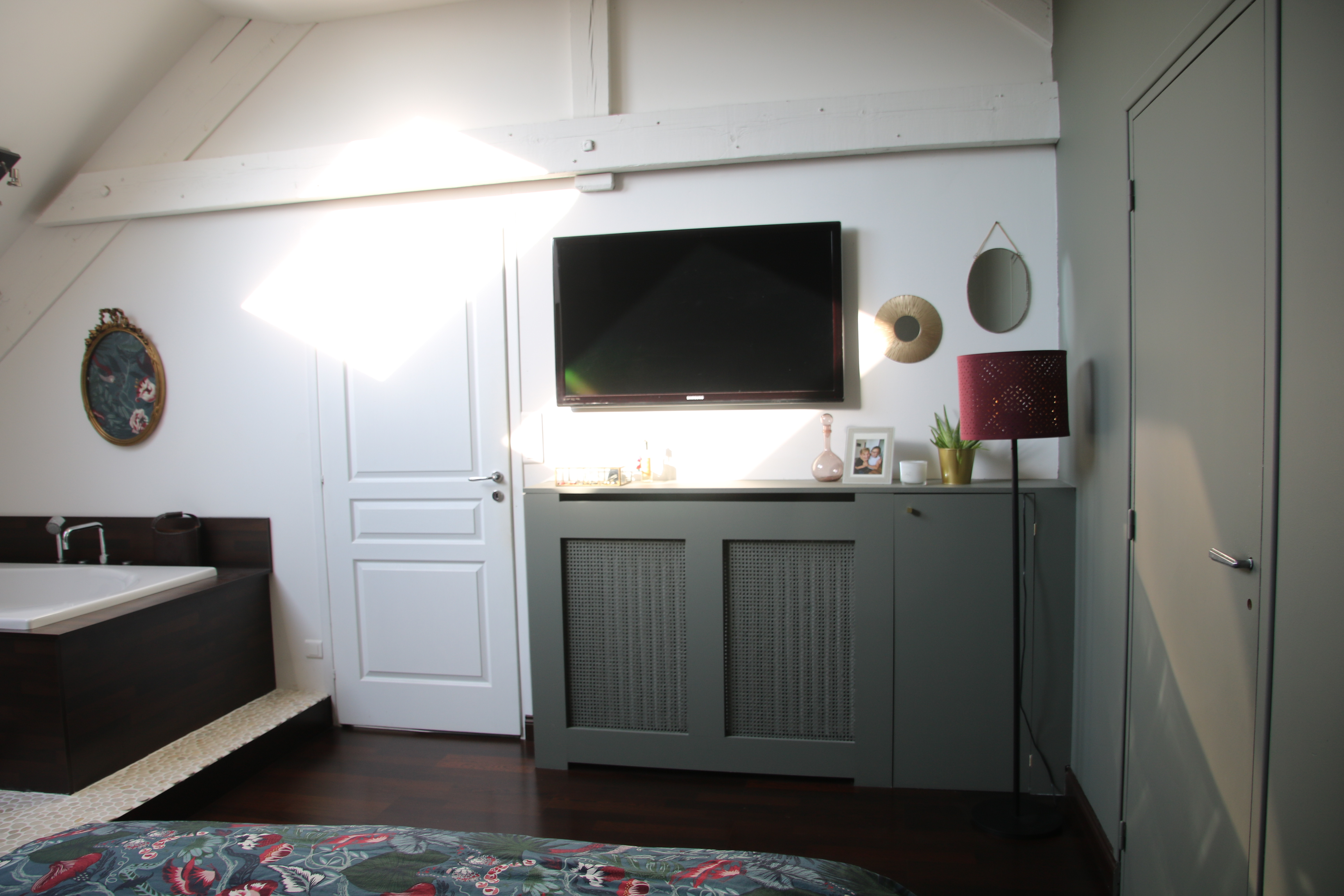 La tête de lit sur mesure peinte dans ce vert de gris profond et enveloppant apporte une ambiance douce et apaisante à cette chambre.